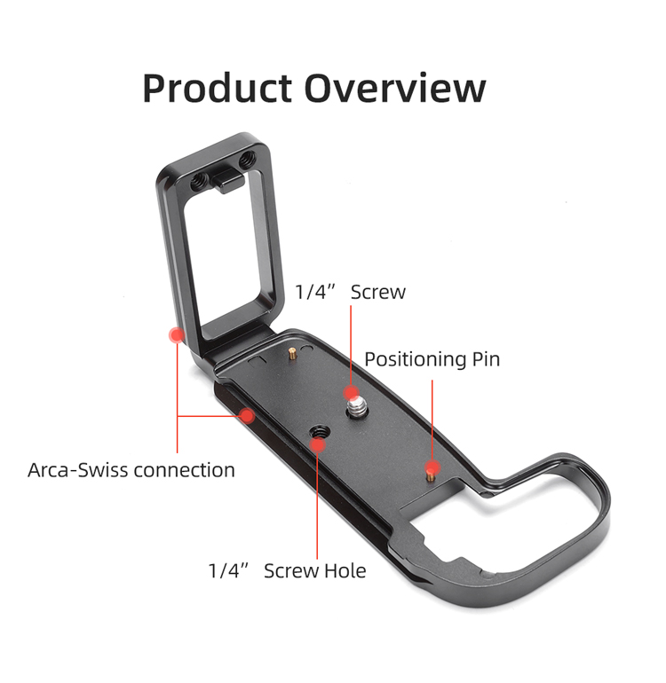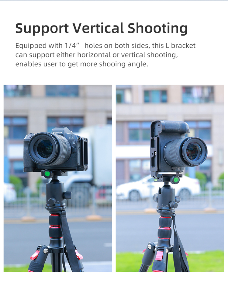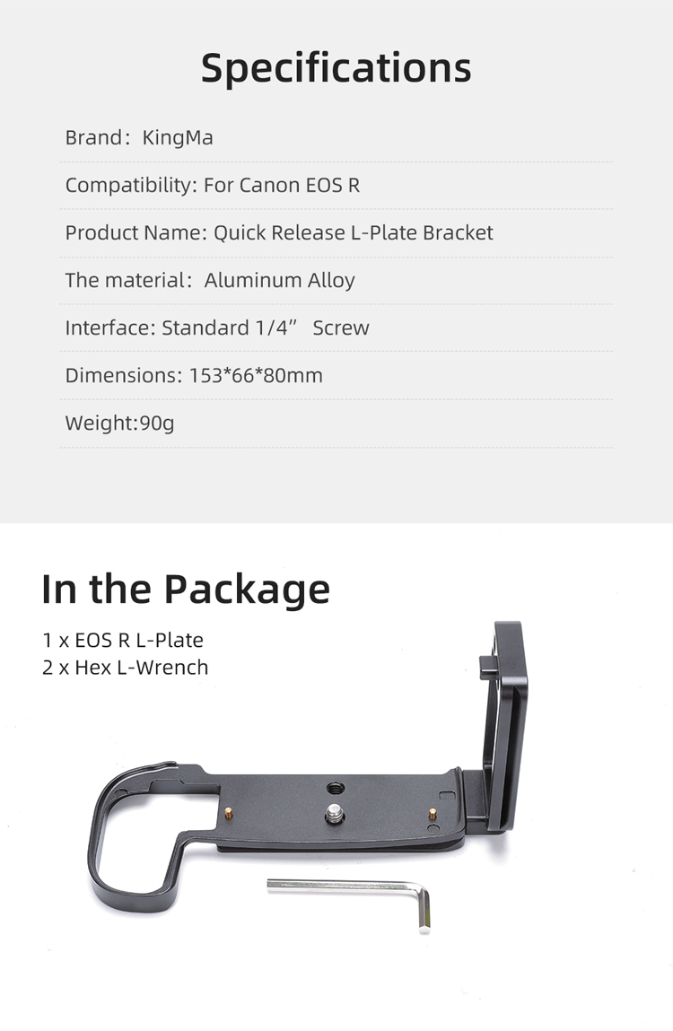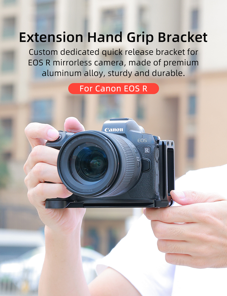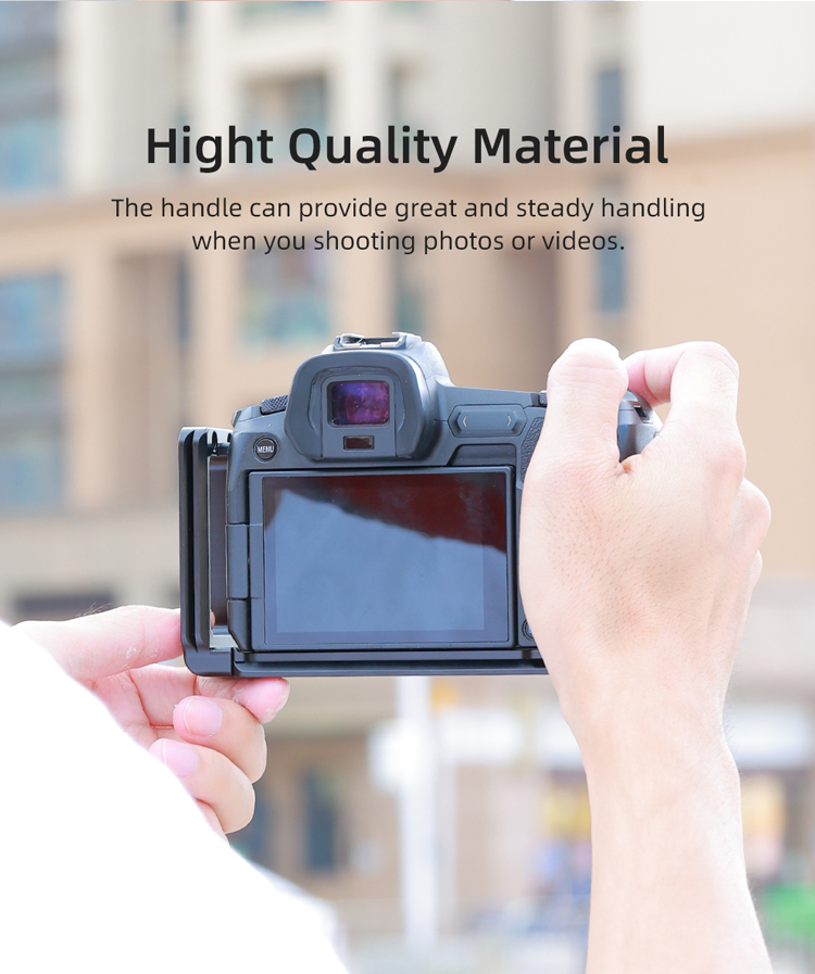 Бічна ручка KingMa L-Bracket BM-EOSR з алюмінієвого сплаву розроблена спеціально для фотоапаратів Canon BM-EOSR і призначена для зручності горизонтальної та вертикальної зйомки, а також кріплення допоміжного обладнання: мікрофона, накамерного світла, монітора та ін. Зручна та легка конструкція не блокує кнопки на камері, забезпечуючи вільний доступ до батарейного відсіку та слоту для картки пам'яті. Bracket BM-EOSR: