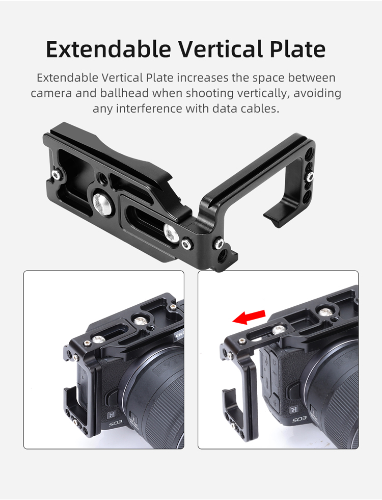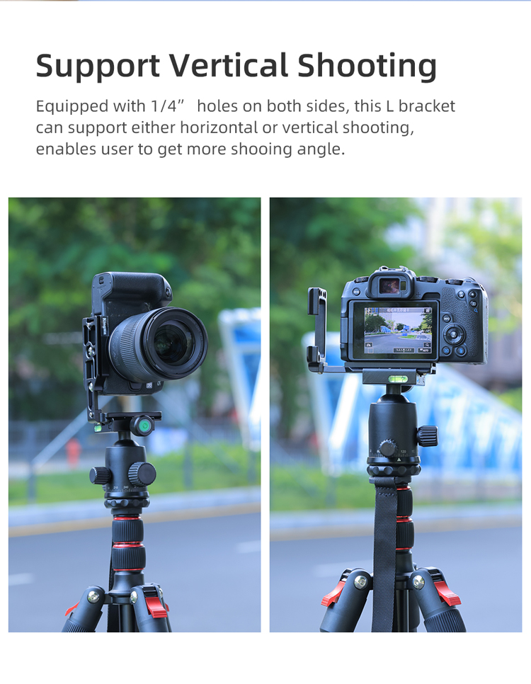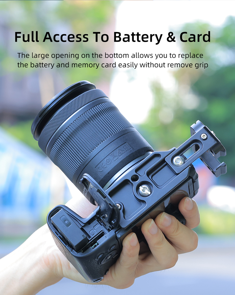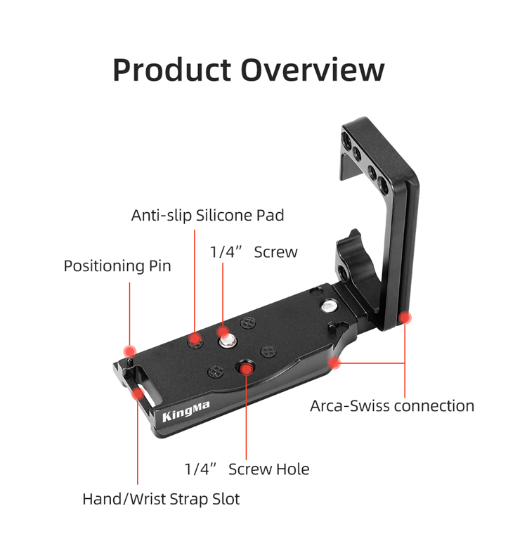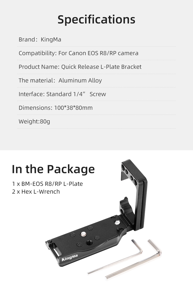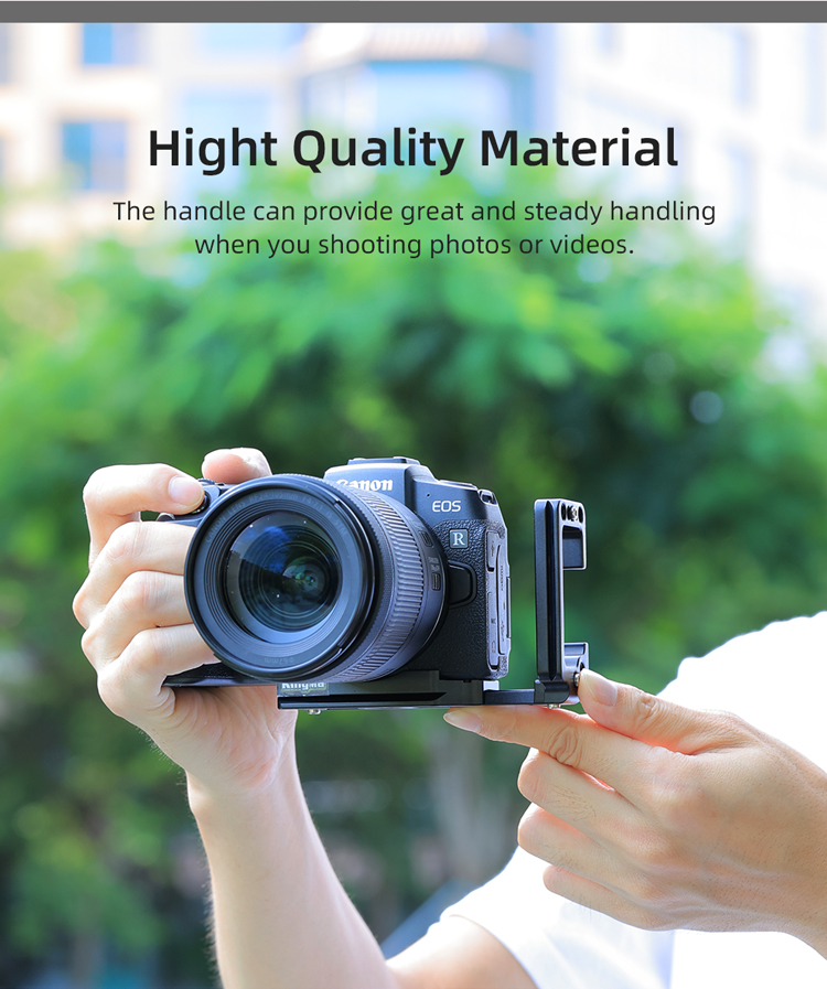 Бічна ручка KingMa L-Bracket KM-R8 з алюмінієвого сплаву розроблена спеціально для фотоапаратів Canon KM-R8 і призначена для зручності горизонтальної та вертикальної зйомки, а також кріплення допоміжного обладнання: мікрофона, накамерного світла, монітора та ін. Зручна та легка конструкція не блокує кнопки на камері, забезпечуючи вільний доступ до батарейного відсіку та слоту для картки пам'яті. Bracket KM-R8: