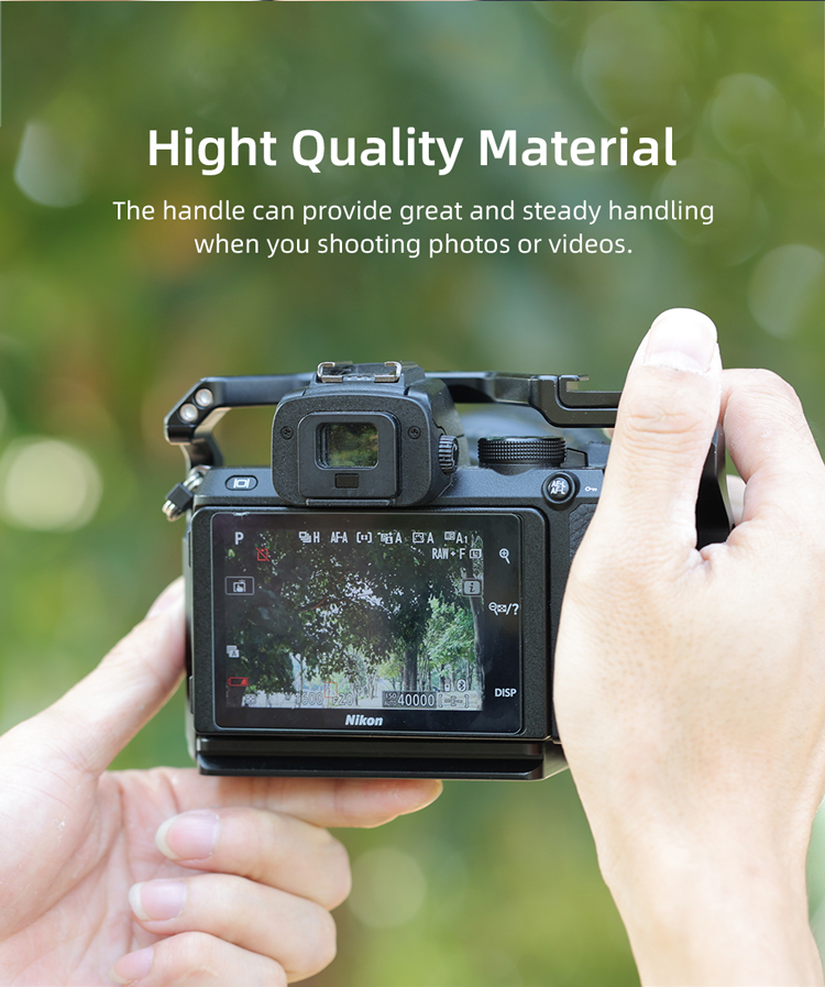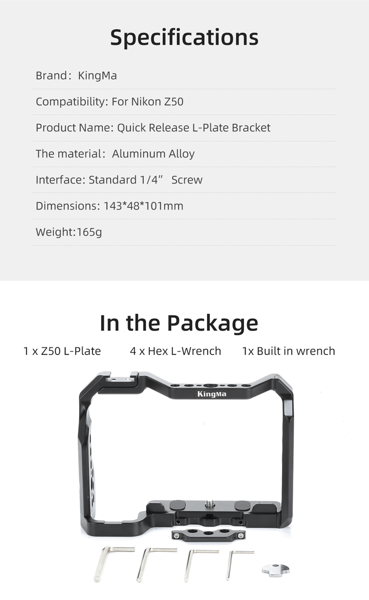 Клітка KingMa Cage R50-RC з алюмінієвого сплаву розроблена спеціально для фотоапаратів Canon EOS R50 і призначена для кріплення допоміжного обладнання: мікрофона , спалахи, накамерного світла, монітора, шарнірних кронштейнів та ін. Зручна та легка конструкція не блокує кнопки на камері, забезпечуючи вільний доступ до батарейного відсіку та слоту для картки пам'яті. R50-RC: