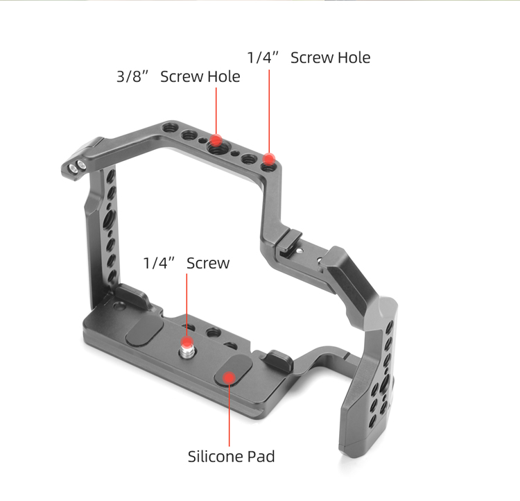 - Кріплення клітини до камери здійснюється за допомогою гвинта 1/4”-20 в основі, а також M2.5 збоку. Гумові прокладки на дні клітини захищають корпус фотоапарата від подряпин.