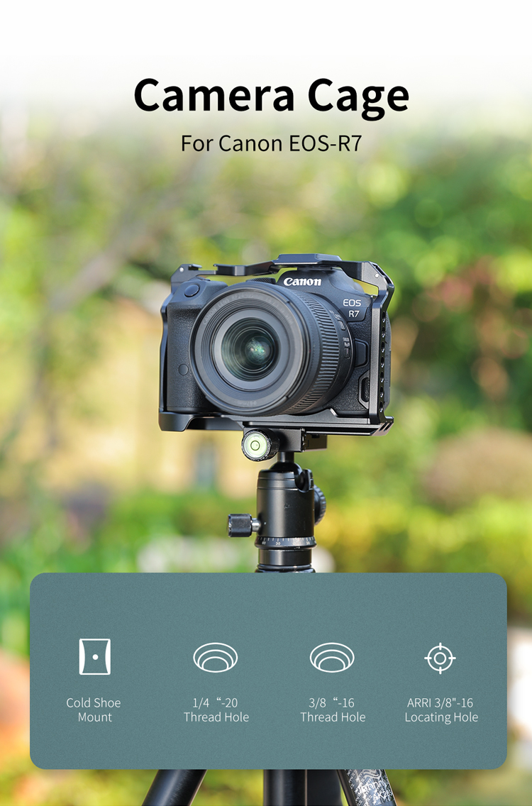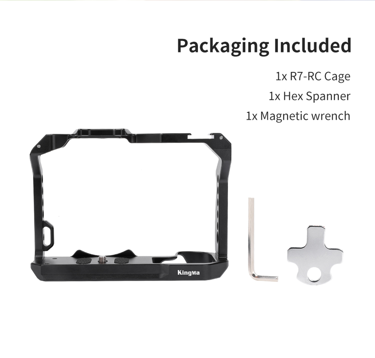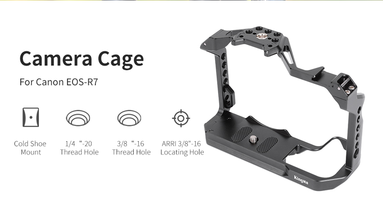 Клітка KingMa Cage R7-RC з алюмінієвого сплаву розроблена спеціально для фотоапаратів Canon R7-RC і призначена для кріплення допоміжного обладнання: мікрофону, спалаху, накамерного світла, монітора, шарнірних кронштейнів та ін. Зручна та легка конструкція не блокує кнопки на камері, забезпечуючи вільний доступ до батарейного відсіку та слоту для картки пам'яті.]: