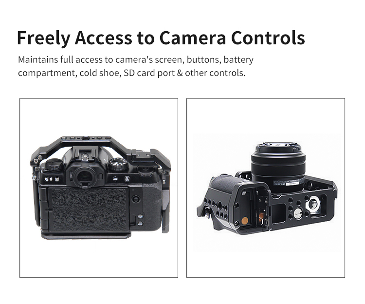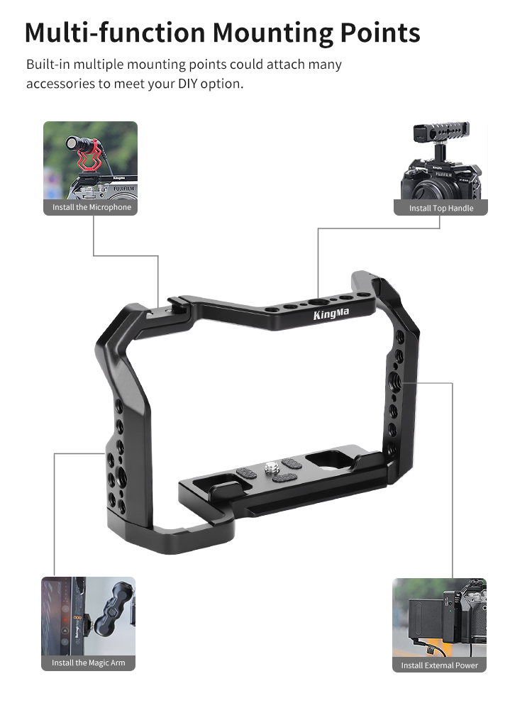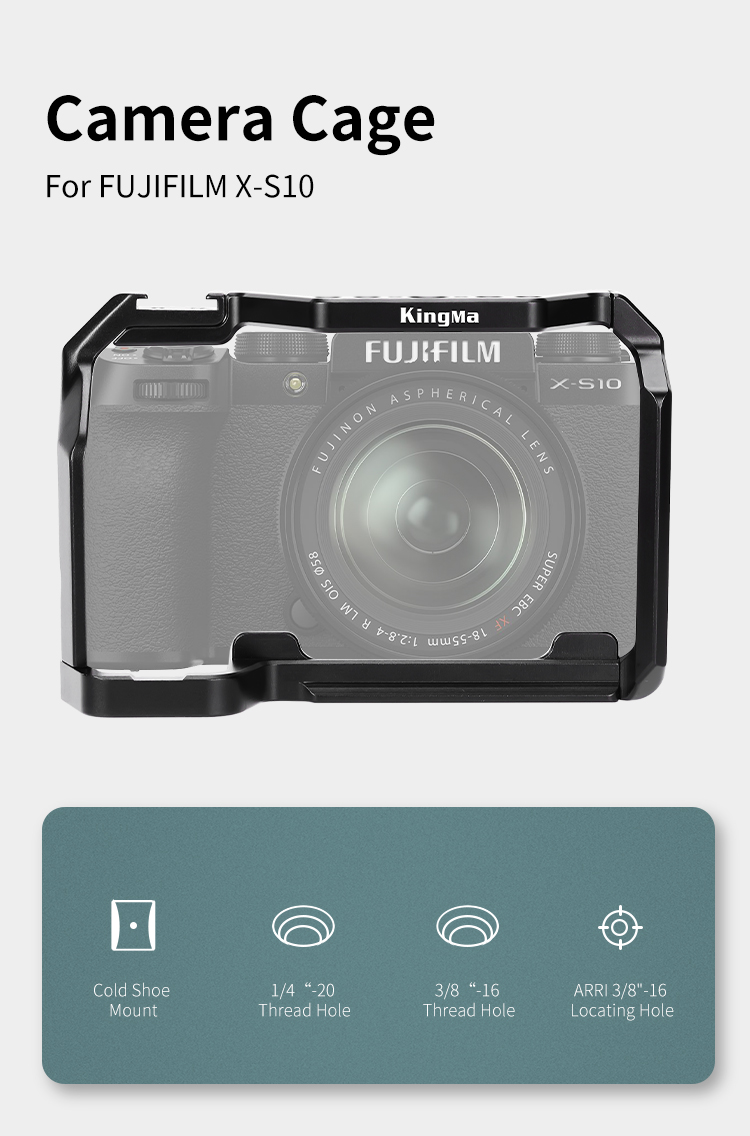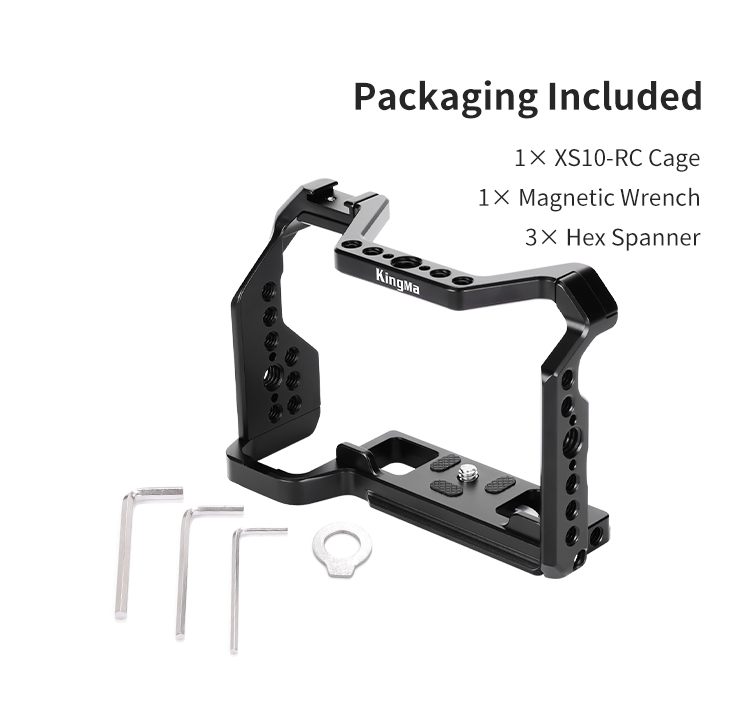 Клітка KingMa Cage XS10-RC з алюмінієвого сплаву розроблена спеціально для фотоапаратів Fujifilm X-S10 і призначена для кріплення допоміжного обладнання: мікрофона , спалахи, накамерного світла, монітора, шарнірних кронштейнів та ін. Зручна та легка конструкція не блокує кнопки на камері, забезпечуючи вільний доступ до батарейного відсіку та слоту для картки пам'яті. XS10-RC: