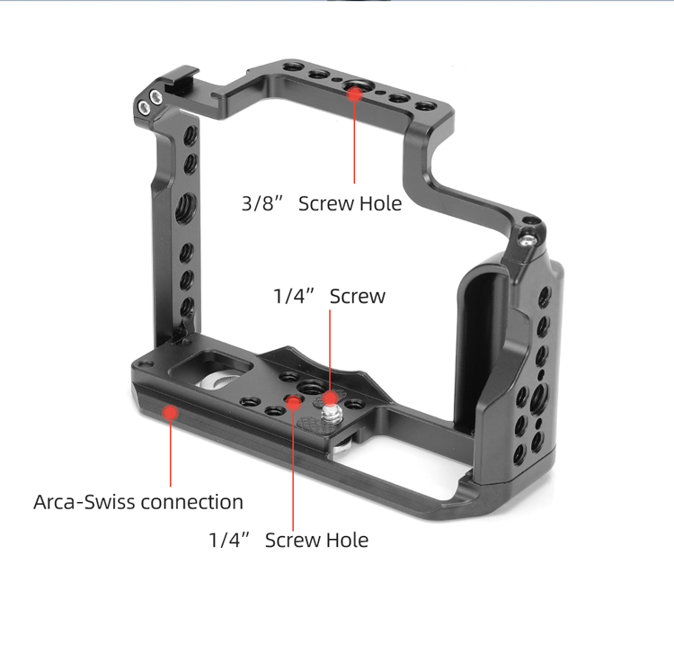 - Кріплення клітини до камери здійснюється за допомогою гвинта 1/4”-20 в основі, а також M2.5 збоку. Гумові прокладки на дні клітини захищають корпус фотоапарата від подряпин.