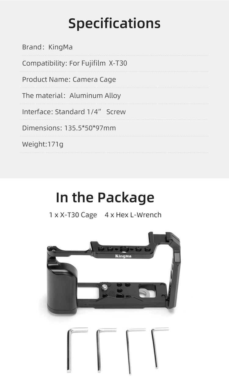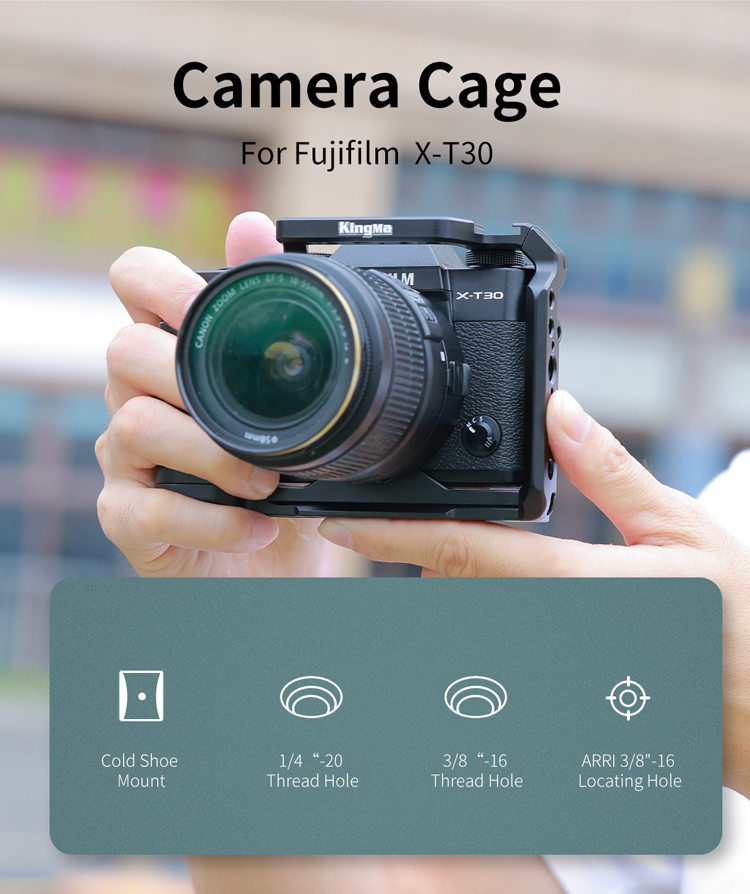 Клітка KingMa Cage XT30-RC з алюмінієвого сплаву розроблена спеціально для фотоапаратів Fujifilm X-T30 X-T20 і призначена для кріплення допоміжного обладнання: мікрофона , спалахи, накамерного світла, монітора, шарнірних кронштейнів та ін. Зручна та легка конструкція не блокує кнопки на камері, забезпечуючи вільний доступ до батарейного відсіку та слоту для картки пам'яті. XT30-RC: