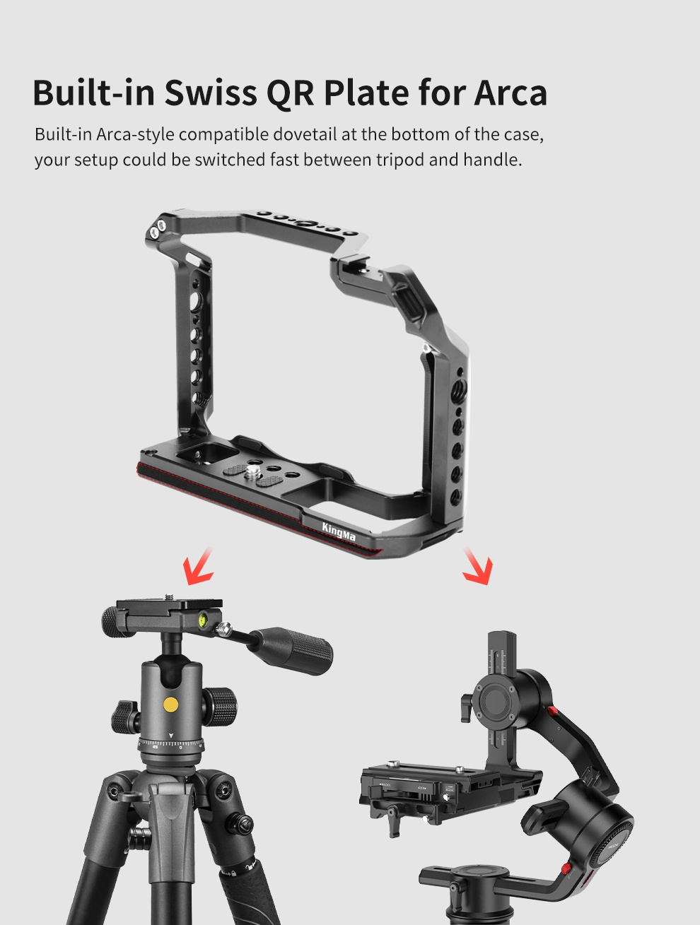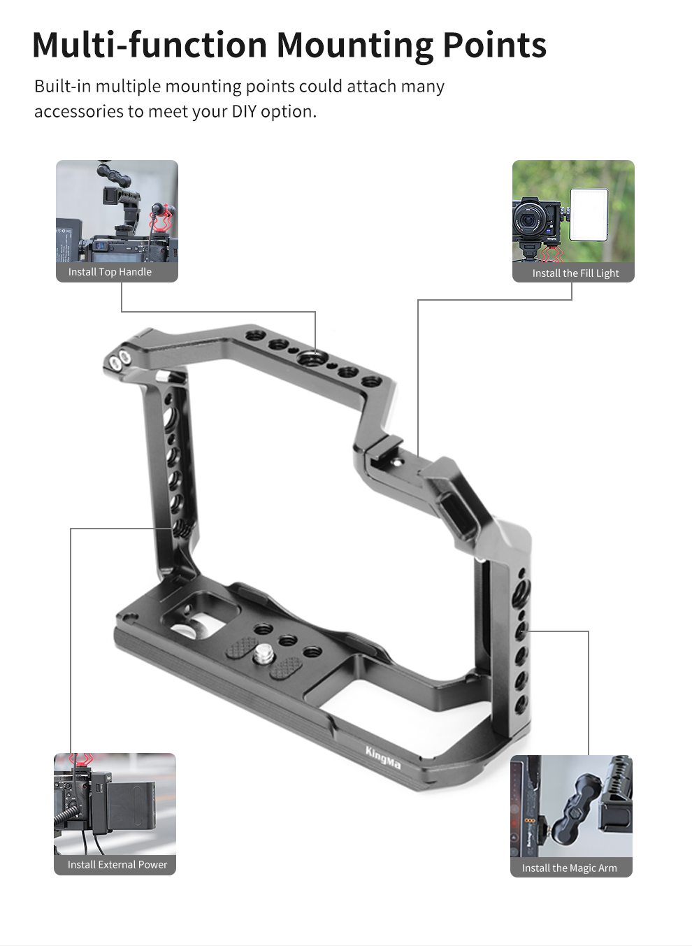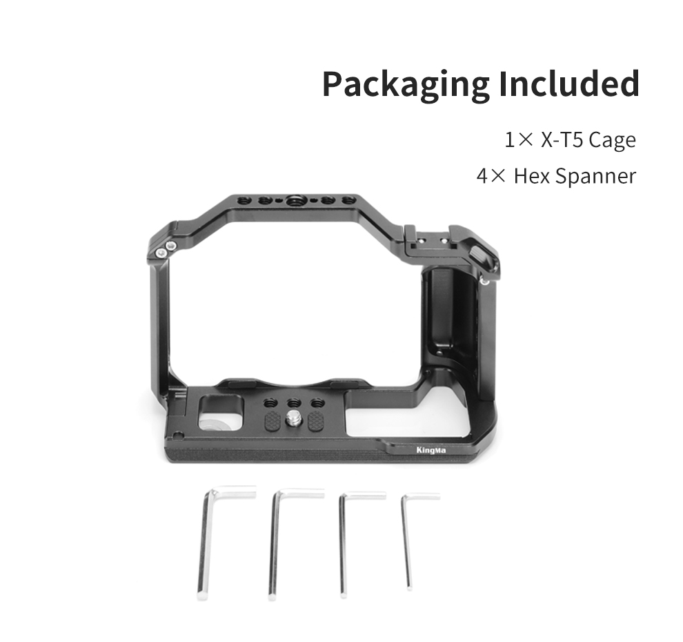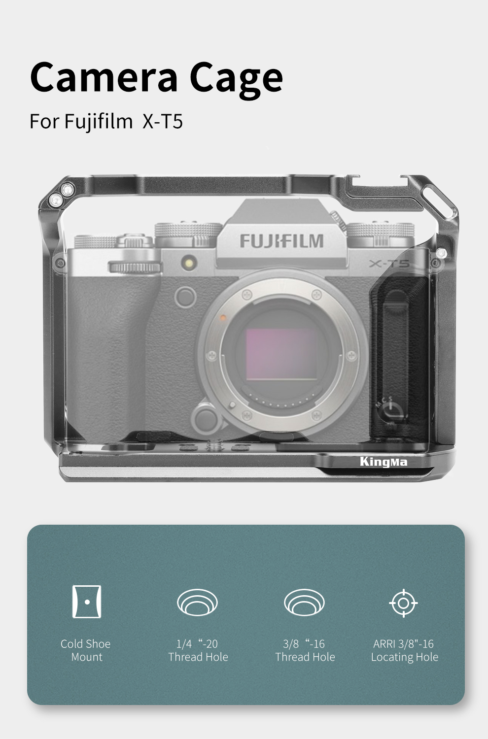 Клітка KingMa Cage XT5-RC з алюмінієвого сплаву розроблена спеціально для фотоапаратів Fujifilm X-T5 і призначена для кріплення допоміжного обладнання: мікрофона , спалахи, накамерного світла, монітора, шарнірних кронштейнів та ін. Зручна та легка конструкція не блокує кнопки на камері, забезпечуючи вільний доступ до батарейного відсіку та слоту для картки пам'яті. XT5-RC: