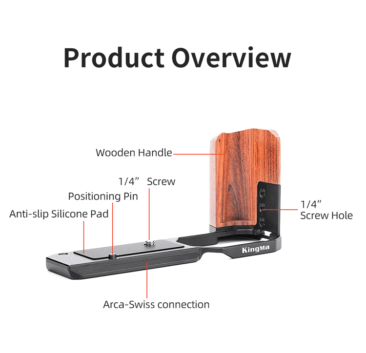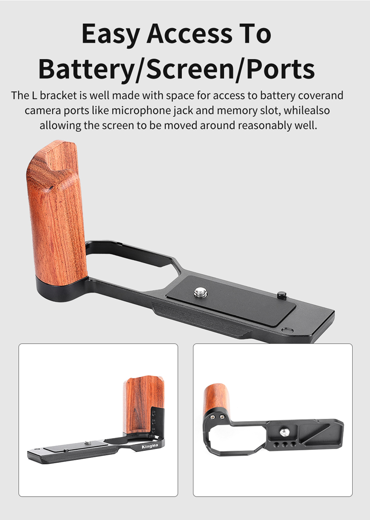 Бічна ручка KingMa L-Bracket KM-ZF з алюмінієвого сплаву розроблена спеціально для фотоапаратів Nikon Z f і призначена для зручності горизонтальної і вертикальної зйомки, а також кріплення допоміжного обладнання: мікрофона, накамерного світла, монітора та ін. Зручна та легка конструкція не блокує кнопки на камері, забезпечуючи вільний доступ до батарейного відсіку та слоту для картки пам'яті. про KingMa L-Bracket KM-ZF: