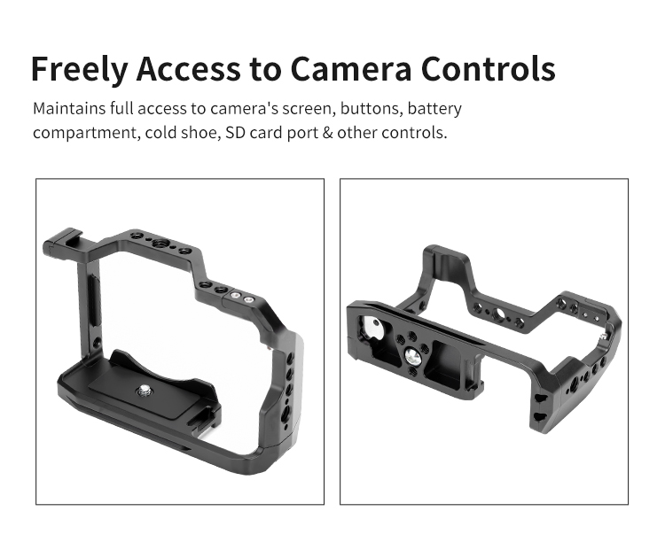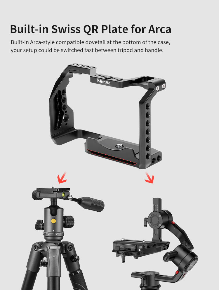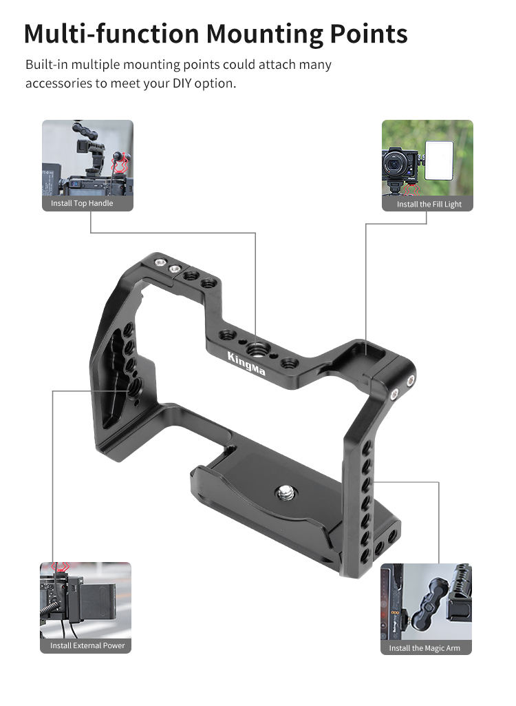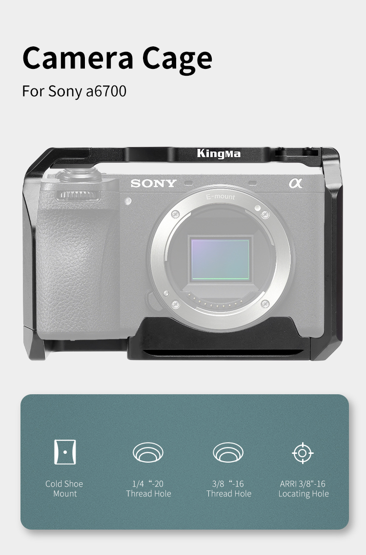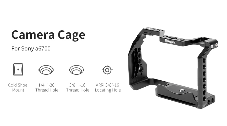 Клітка KingMa Cage A6700-RC з алюмінієвого сплаву розроблена спеціально для фотоапаратів Sony Alpha A6700 і призначена для кріплення допоміжного обладнання: мікрофона , спалахи, накамерного світла, монітора, шарнірних кронштейнів та ін. Зручна та легка конструкція не блокує кнопки на камері, забезпечуючи вільний доступ до батарейного відсіку та слоту для картки пам'яті. A6700-RC: