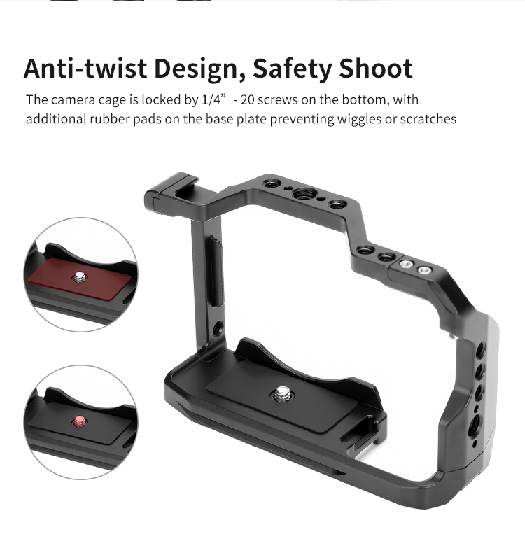 - Кріплення клітини до камери здійснюється за допомогою гвинта 1/4”-20 в основі, а також M2.5 збоку. Гумові прокладки на дні клітини захищають корпус фотоапарата від подряпин.