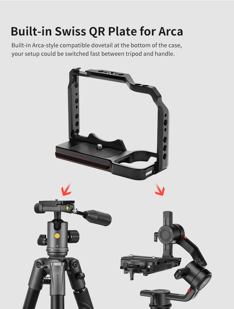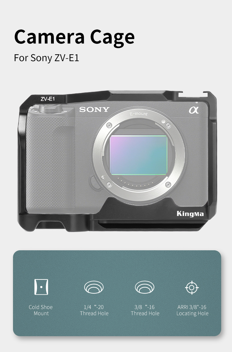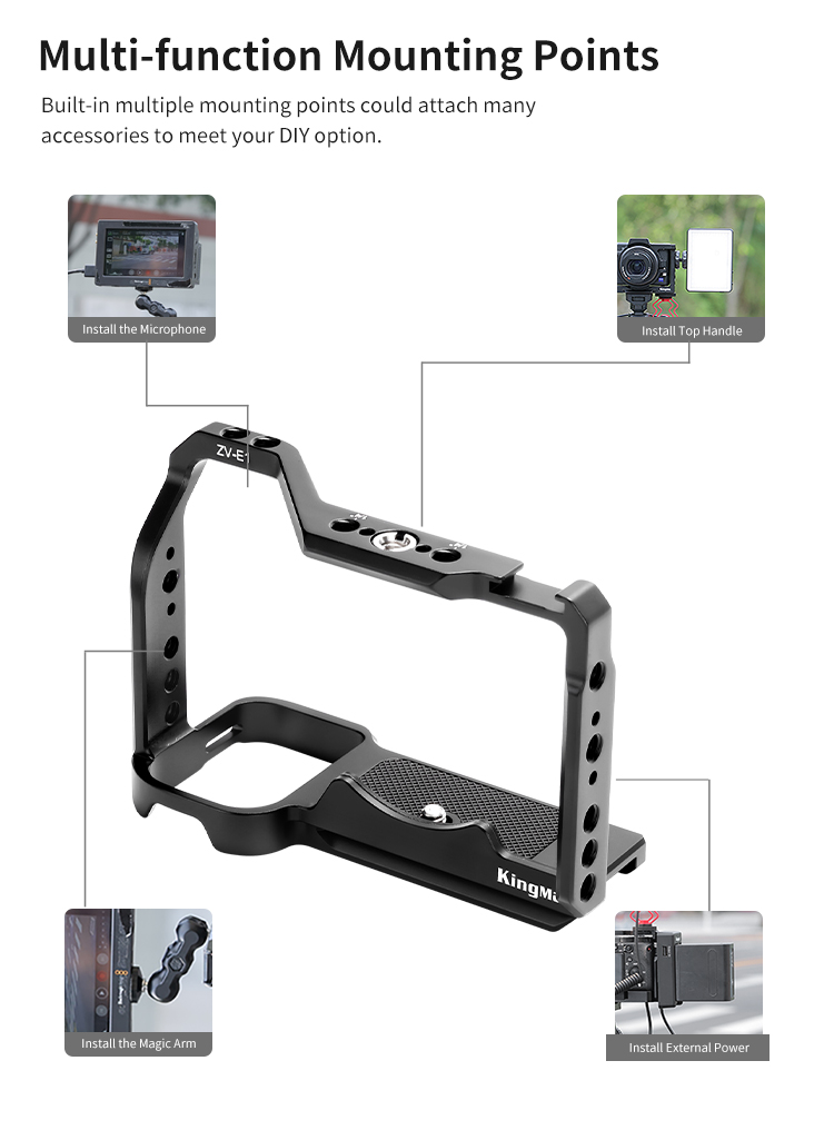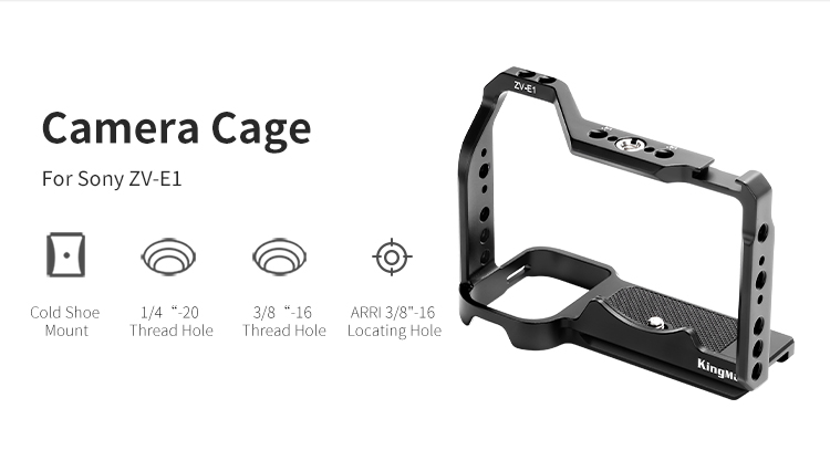 Клітка KingMa Cage ZVE1-RC з алюмінієвого сплаву розроблена спеціально для фотоапаратів Sony ZV-E1 і призначена для кріплення допоміжного обладнання: мікрофона , спалахи, накамерного світла, монітора, шарнірних кронштейнів та ін. Зручна та легка конструкція не блокує кнопки на камері, забезпечуючи вільний доступ до батарейного відсіку та слоту для картки пам'яті. ZVE1-RC: