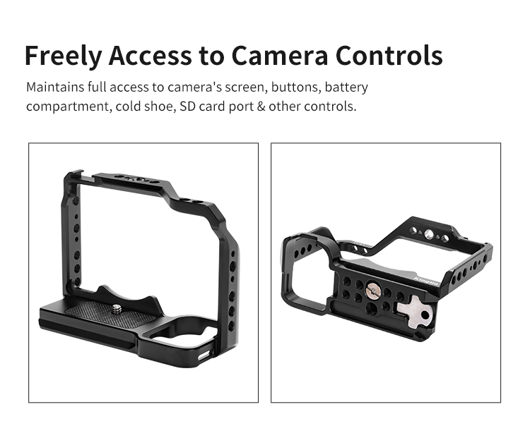 - Кріплення клітини до камери здійснюється за допомогою гвинта 1/4”-20 в основі, а також M2.5 збоку. Гумові прокладки на дні клітини захищають корпус фотоапарата від подряпин.