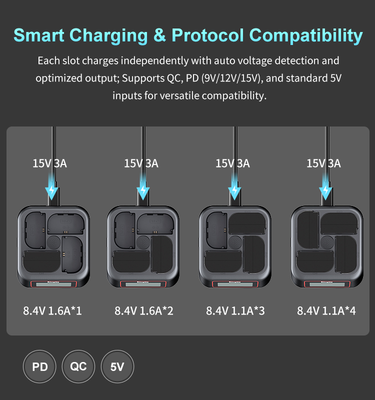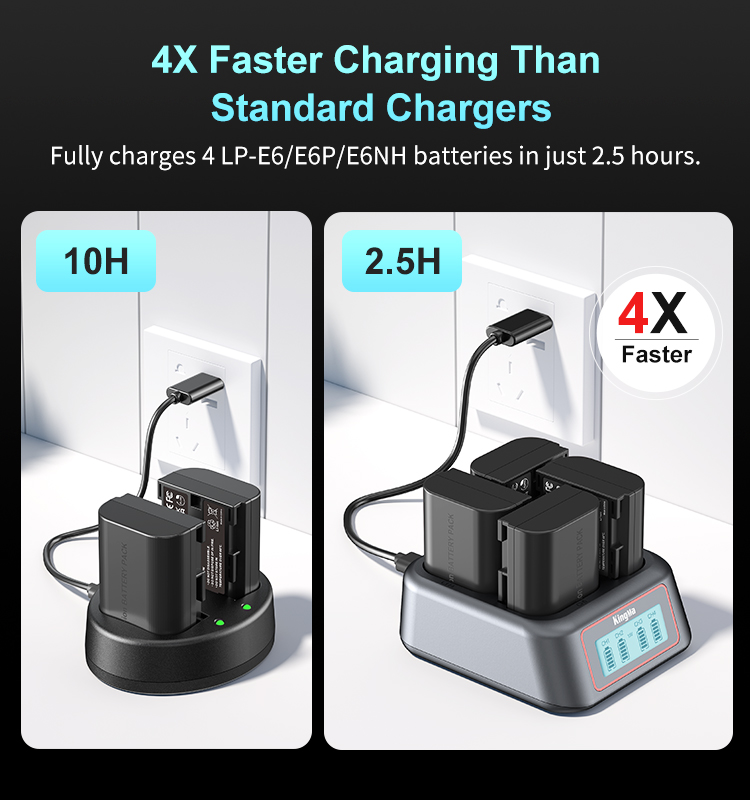 Швидкий і компактний зарядний пристрій KingMa BM069-LPE6 дозволяє зардяджати одночасно 4 акумулятора Canon LP-E6 . В режимі швидкої зарядки (PD 15V 3A) ви зможете повністю зарядити 4 акумулятора лише за 2.5 години. Кожен слот заряджається незалежно з автоматичним визначенням напруги.