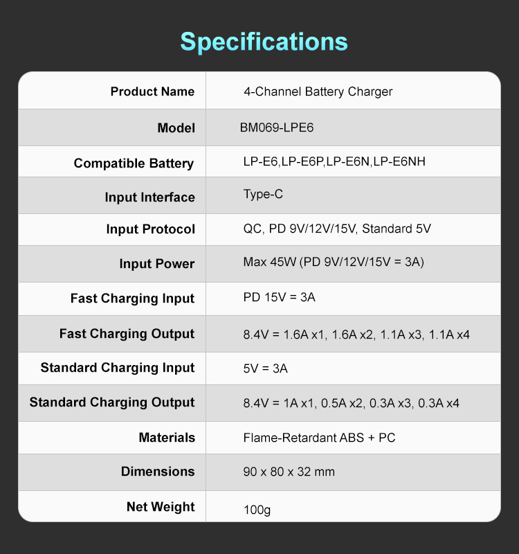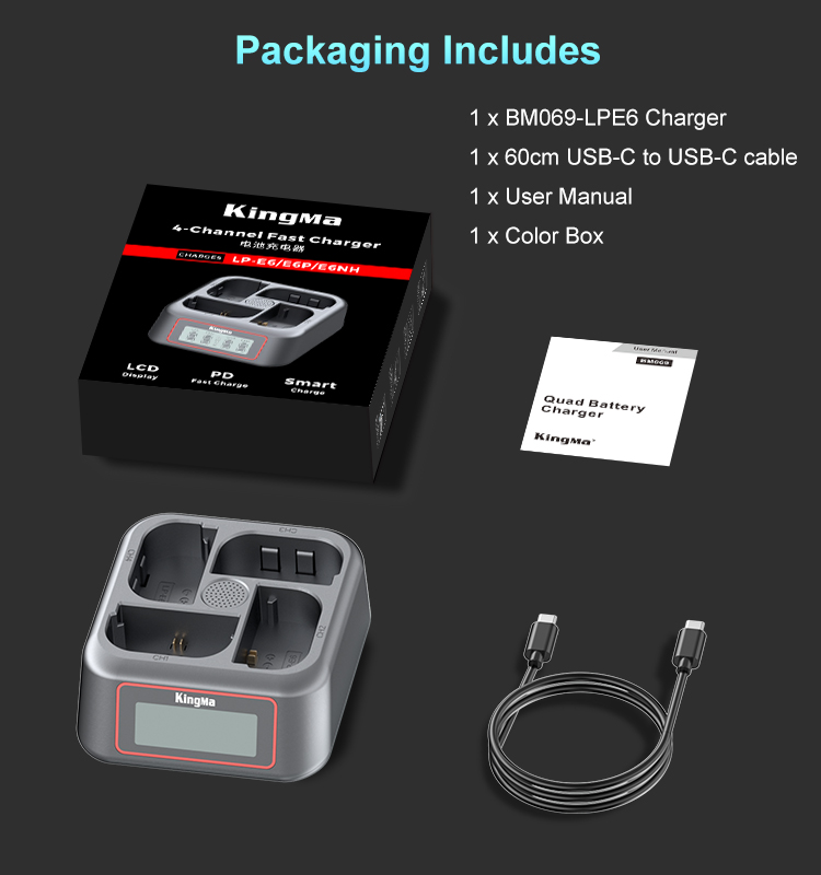 | Модель | KingMa BM069-LPE6 4-Channel Battery Charger |