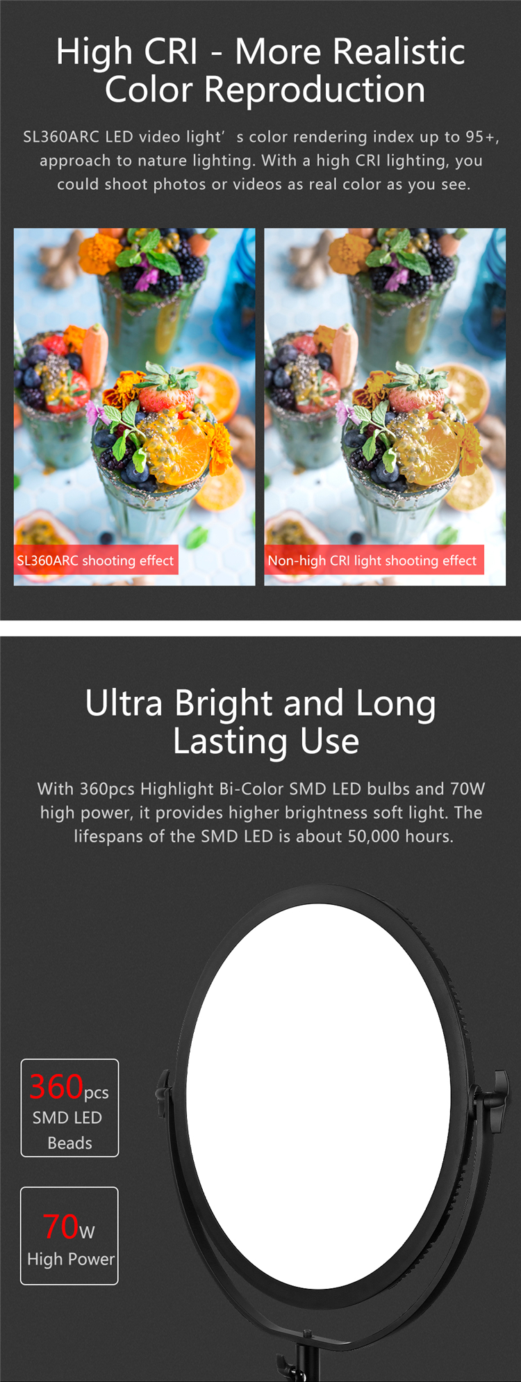Коефіцієнт передачі кольорів (CRI) постійного світла SL360ARC становить більше 95%, що дозволяє передавати кольори об'єкта зйомки з максимальною точністю. А правильно вибраний кут освітлення до 180 ° дозволяє уникнути кутових затемнень і центрального "пересвітлення". Вбудований матовий розсіювач ідеально підходить для портретної фотозйомки.