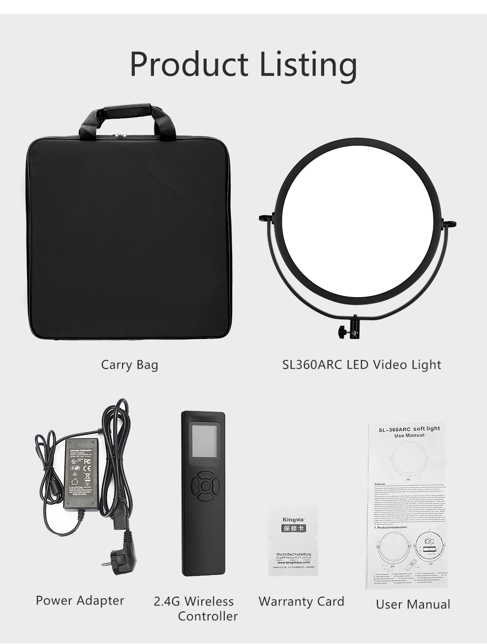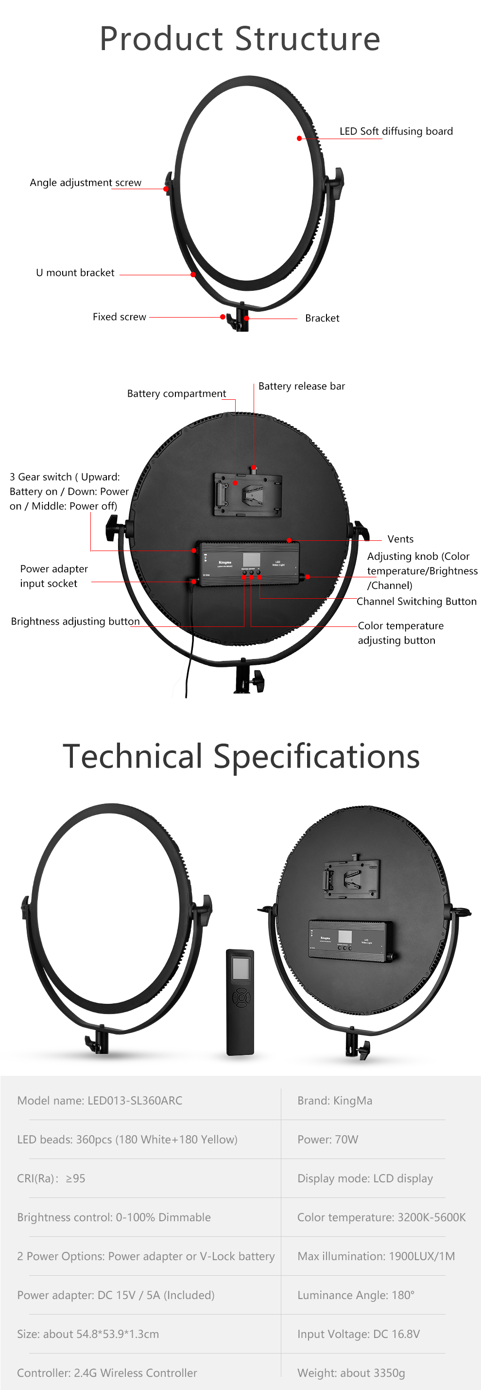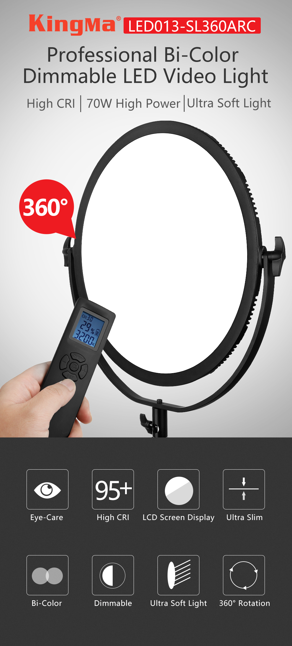 Професійний біколорний Ultra Soft Light LED освітлювач KingMa SL360ARC товщиною лише 1.3 см складається з 360 світлодіодів SMD LED Beads ультрависокої яскравості з можливістю плавного регулювання колірної температури та яскравості. В якості живлення для камерного освітлювача KingMa SL360 використовуються: блок живлення 15V 5A від мережі 220V (входить до комплекту), або V-Lock / V-Mount акумулятори.