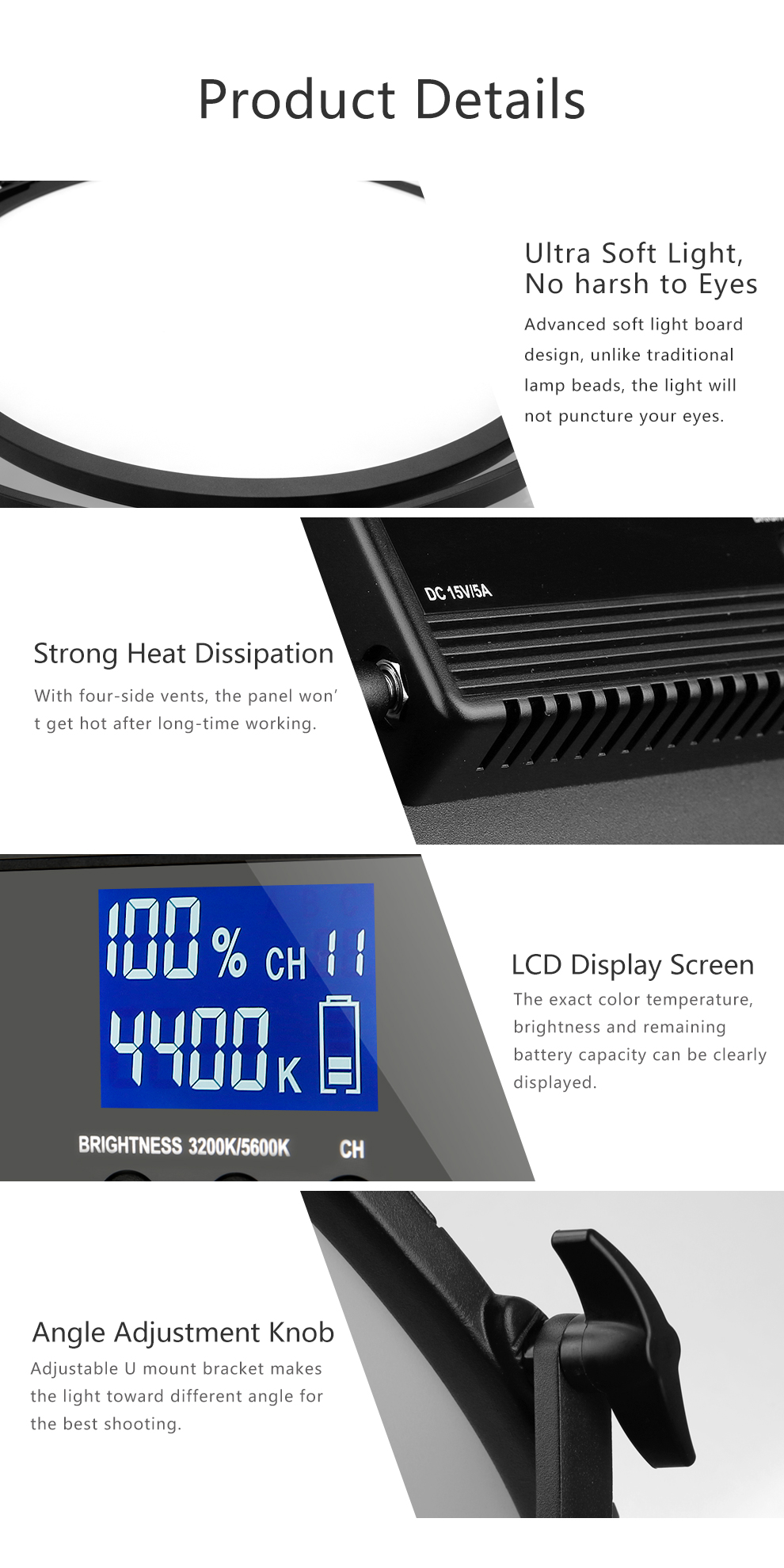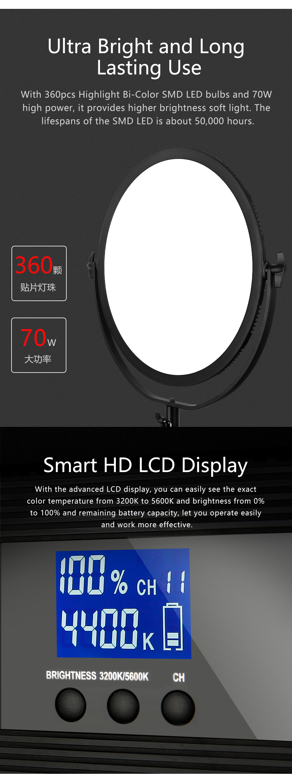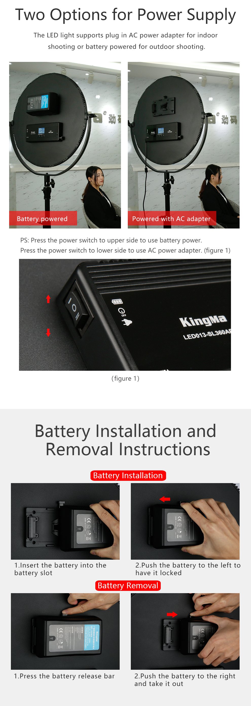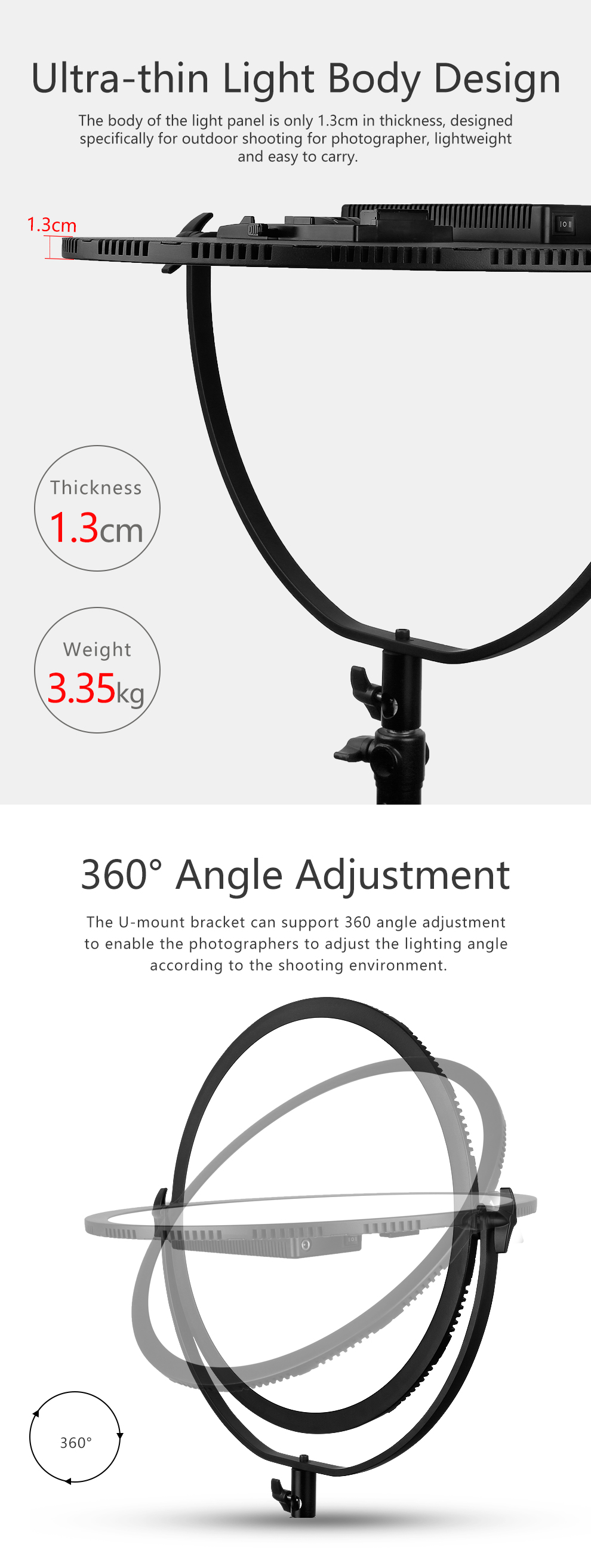 Професійний біколорний Ultra Soft Light LED освітлювач KingMa SL360ARC товщиною лише 1.3 см складається з 360 світлодіодів SMD LED Beads ультрависокої яскравості з можливістю плавного регулювання колірної температури та яскравості. В якості живлення для камерного освітлювача KingMa SL360 використовуються: блок живлення 15V 5A від мережі 220V (входить до комплекту), або V-Lock / V-Mount акумулятори.