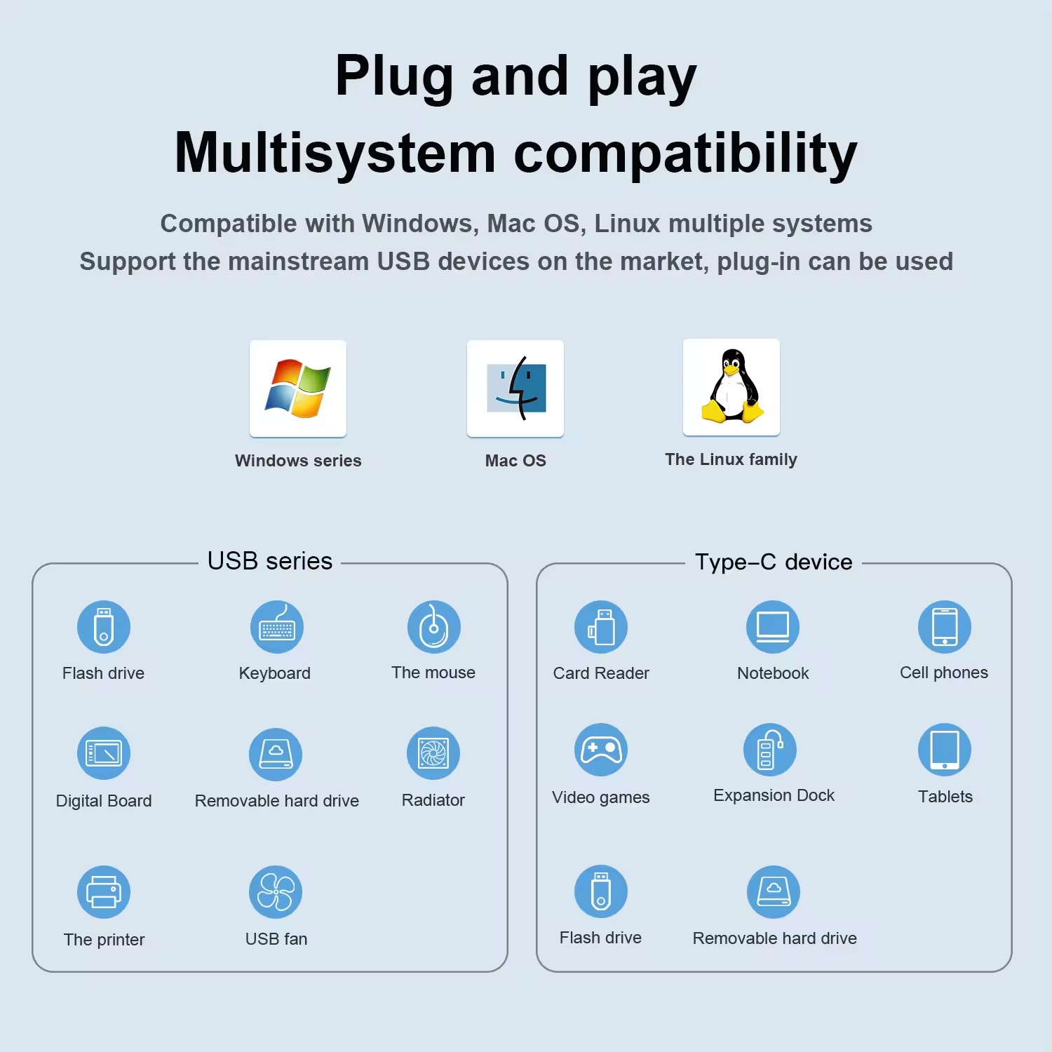 - Зручне використання: жодне програмне забезпечення не потрібне - Plug&Play. Підтримує всі версії Windows, Mac OS, Linux, що мають USB Type-C.